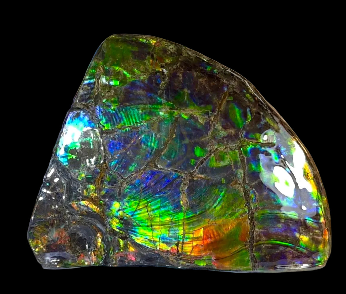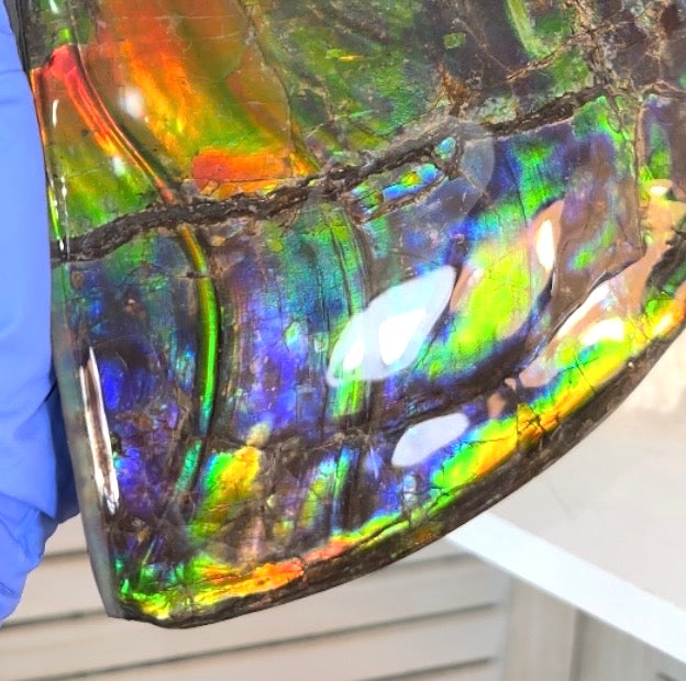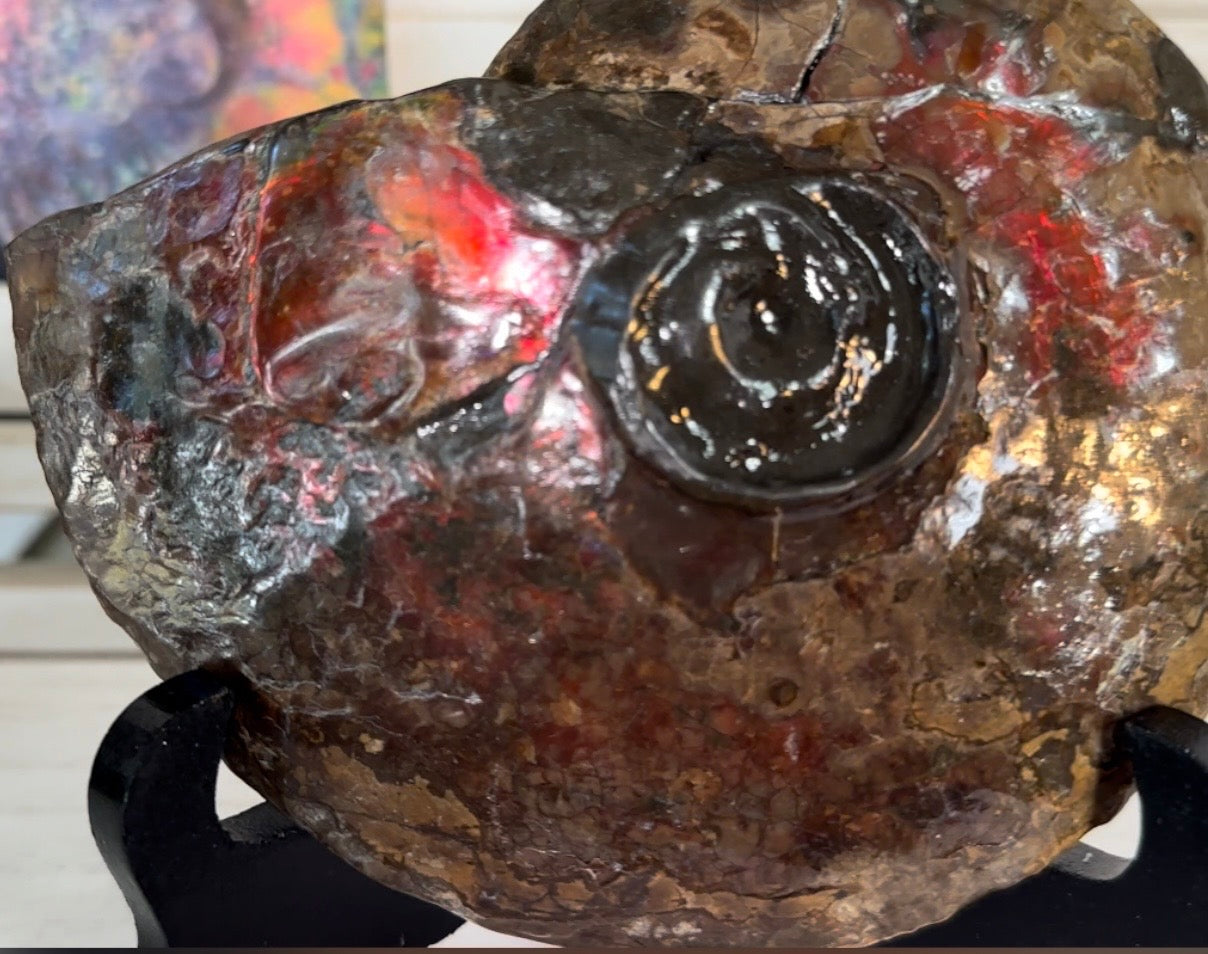 This gem grade ammonite fossil has a rainbow of colors. Rare purples, blues, greens, red, yellow and hints of pink. The gem has a slight chromatic color shift. And the striations are well defined on the fossil.